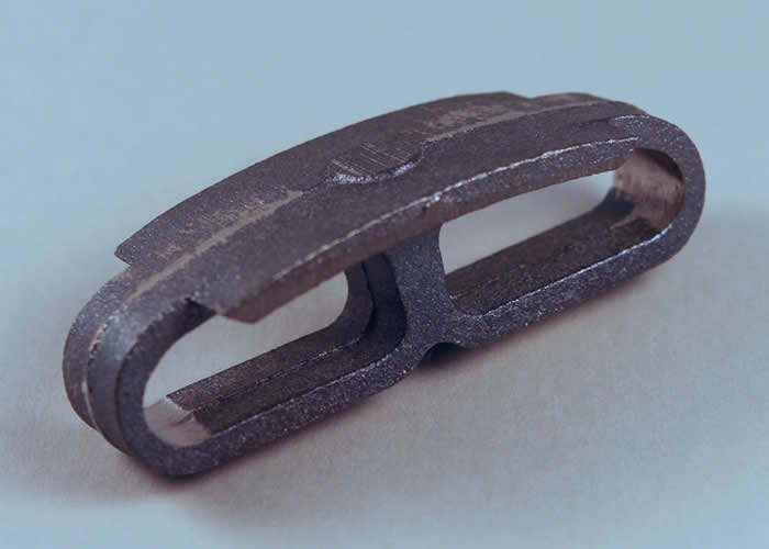 The L-448 is a four-inch pitch, three-inch-wide link and is an interlocking type, also. It is a “T-section” link and preceded the ML-448 tubular link in design. The link is machined in the same manner as the tubular link, with much the same results. However, the link cannot be properly “burned out,” as there is no aperture to facilitate airflow into the internal lug area. When subjected to tensile testing, this link fails at nineteen thousand p.s.i. The failure mode is the fracture of the large hole-bearing wall.